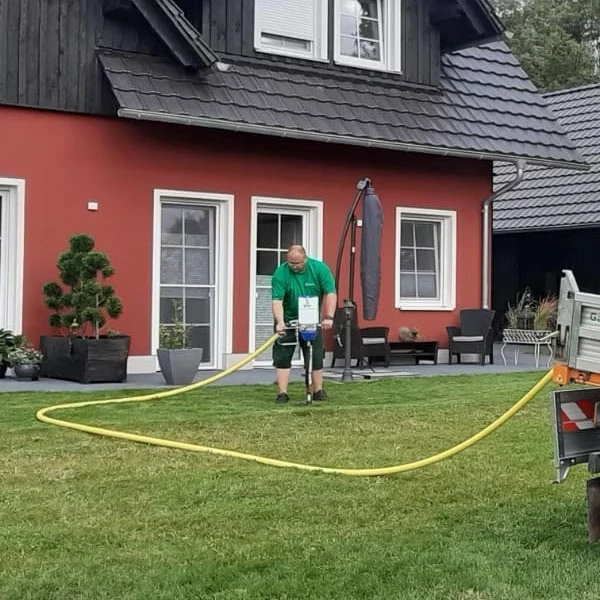 With soil aeration, compressed air is blown into the soil with a compressed air lance or, in other words, shot into it. The existing solid soil structure is broken up and oxygen-permeable. This creates air spaces and soil pores, with the result that the soil can breathe again and carry water.