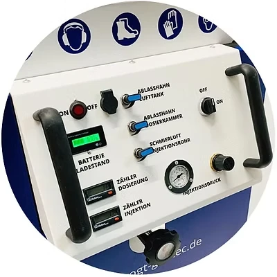 The 40-liter material tank can be filled with granules up to 4mm grain size at any time without switching the mechanism pressureless. Flexible working is possible due to the 7 m (optional 10 m) long injection hose around the supply unit. The quantity-adjustable dosing chamber in combination with the electrical trigger technique on the VOGT TurboSpaten enables fast and reliable work.